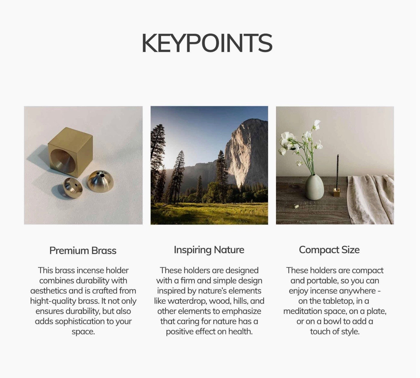 Minimalist water drop shape incense holder made of brass. The holder is versatile, it can be used by itself, inside a bowl or on top of a plate. The diameter of the hole is about 2.8mm which is suitable for the incense with the diameter less than 2.5mm. Dimension: 2.3cm(H) x 1.6cm (W)