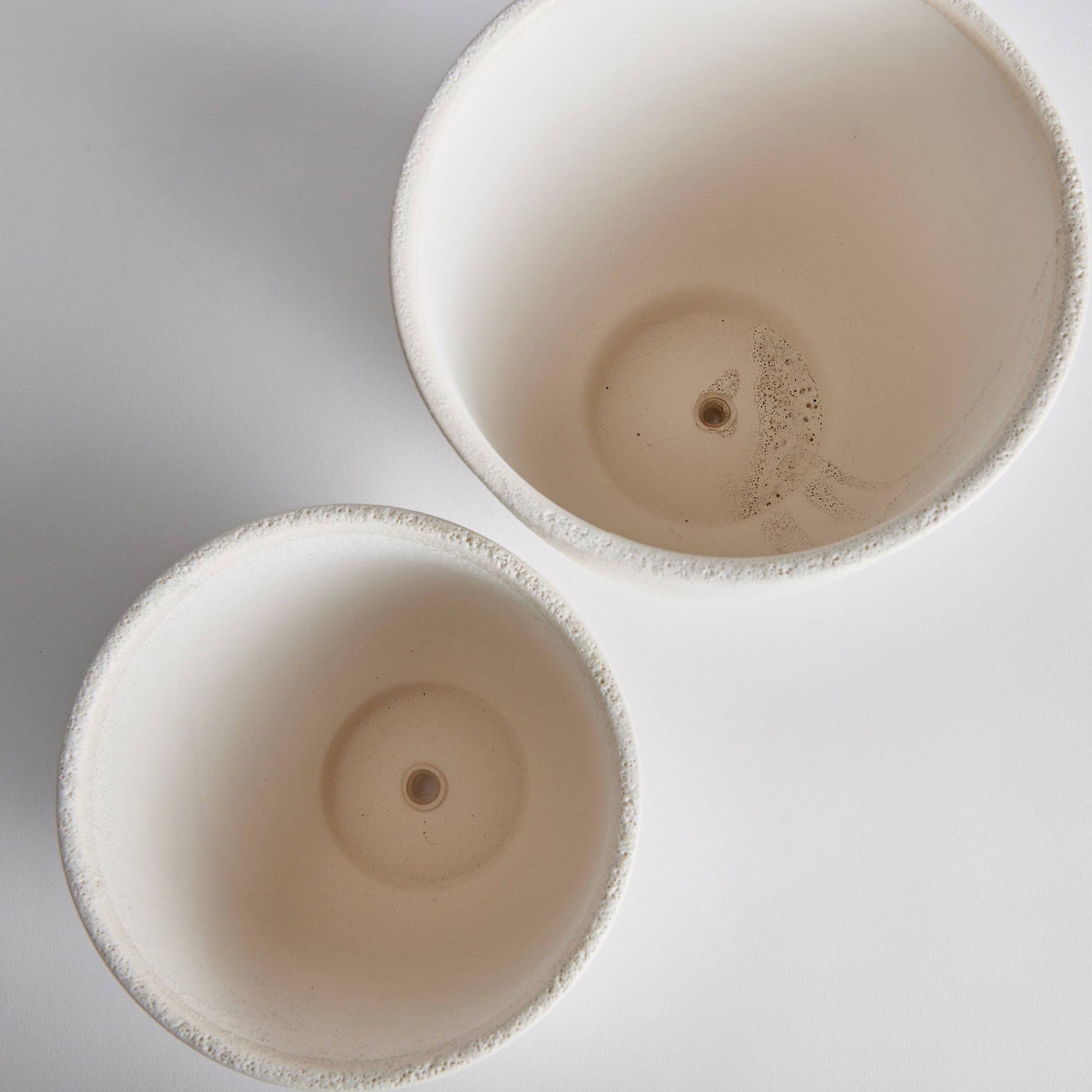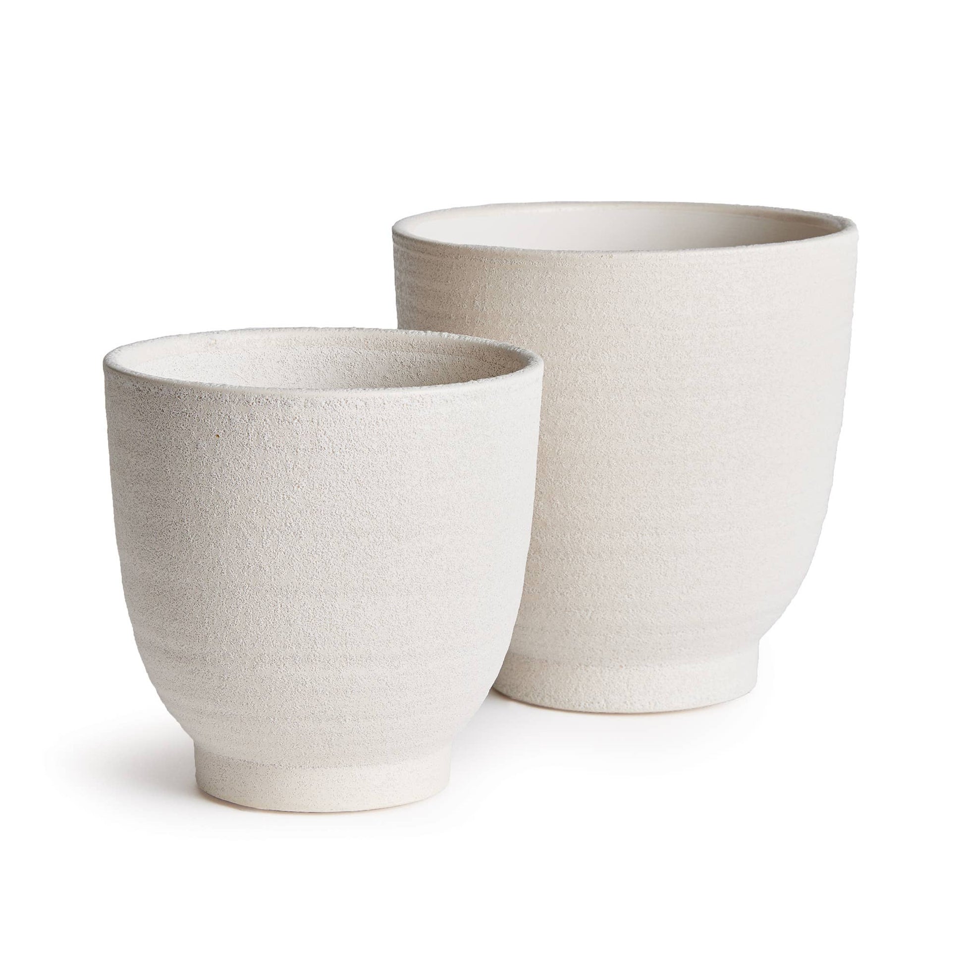 With a subtle ribbing, uneven texture and basic form, these pots are simple and modern. Great alone or with an orchid. In a matte warm white sandy texture glaze, they're like freshly made ceramic pieces direct from the hands of the artist.
