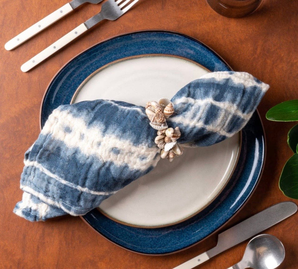 Hand-dyed and designed with a beautiful pattern, these Tie Dye Dinner Napkins are in beautiful shades of Indigo and beige. Made of a soft cotton and linen blend, these tea towels not only provide a fun, rustic look, but are also durable and easy to clean. Details Hand-dyed Due to the inherent natural qualities of the material each piece will vary slightly.